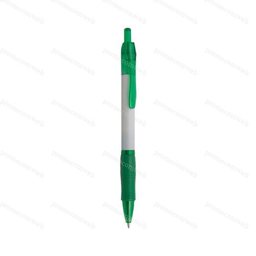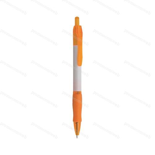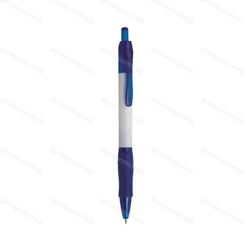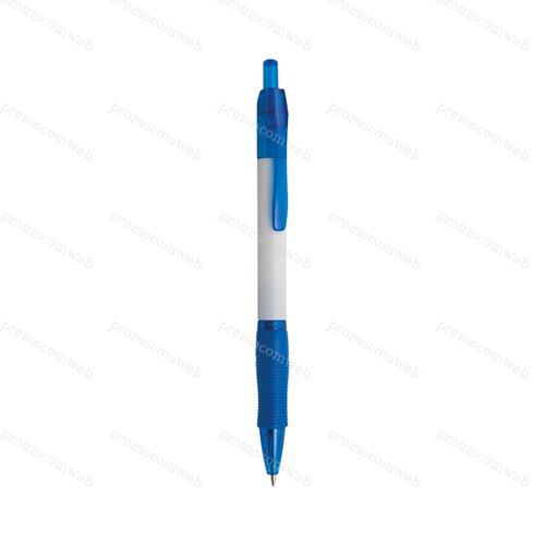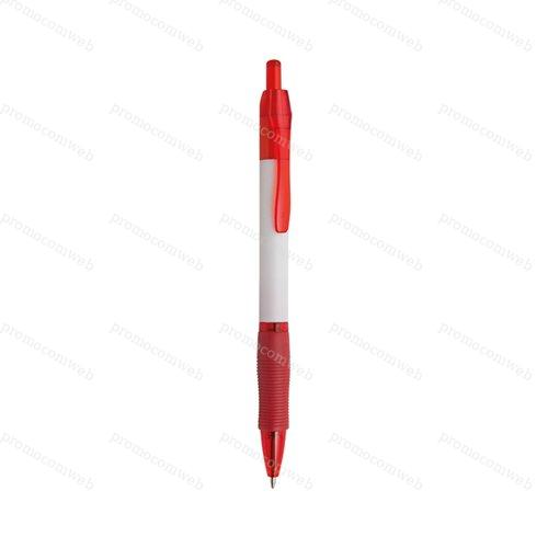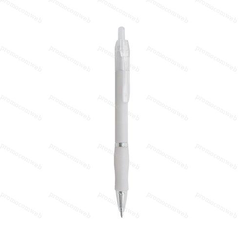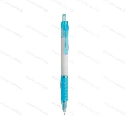 penna a sfera meccanismo a scatto corpo in plastica bianca grip colorata in gomma clip e minuterie in plastica trasparente colorata refill con sfera al tungsteno inchiostro nero tecnica di stampa consigliata: serigrafica - tampografica - UV