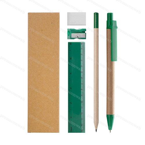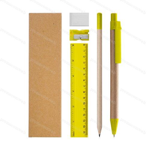 set penna + matita + righello + gomma + temperamatite 1 penna a sfera con corpo in carta riciclata 1 matita in finitura colorata fornita gi temperata 1 righello 15 cm in plastica 1 gomma per cancellare 1 temperamatite in plastica corredato di astuccio in carta naturale tecnica di stampa consigliata: serigrafica - tampografica - UV
