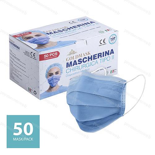 mascherina chirurgica facciale uso medico tipo II capacita' filtraggio > 98% idrorepellente con elastici 3 starti di TNT box da 50 pezzi sigillato 5 PEZZI IN POLYBAG UNI EN 14683:2019 CE MADE IN ITALY