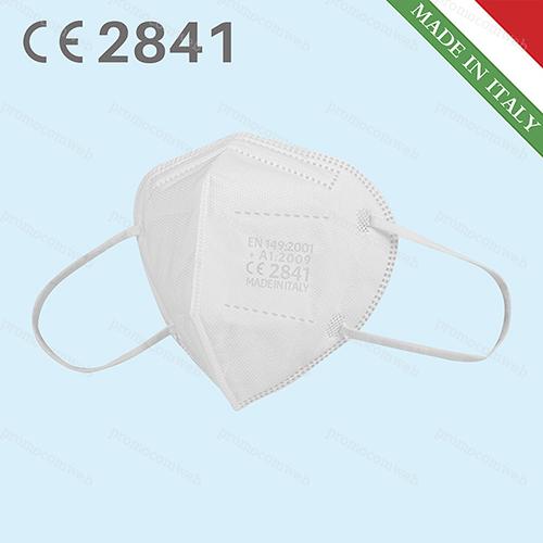 maschera protettiva FFP2 made in italy imbustate singolarmente conforme alla norma UNI EN 149:2001+A1:2009 sistema filtrante a 5 strati strato a contatto con la pelle morbido e non abrasivo capacita' filtraggio > 95%